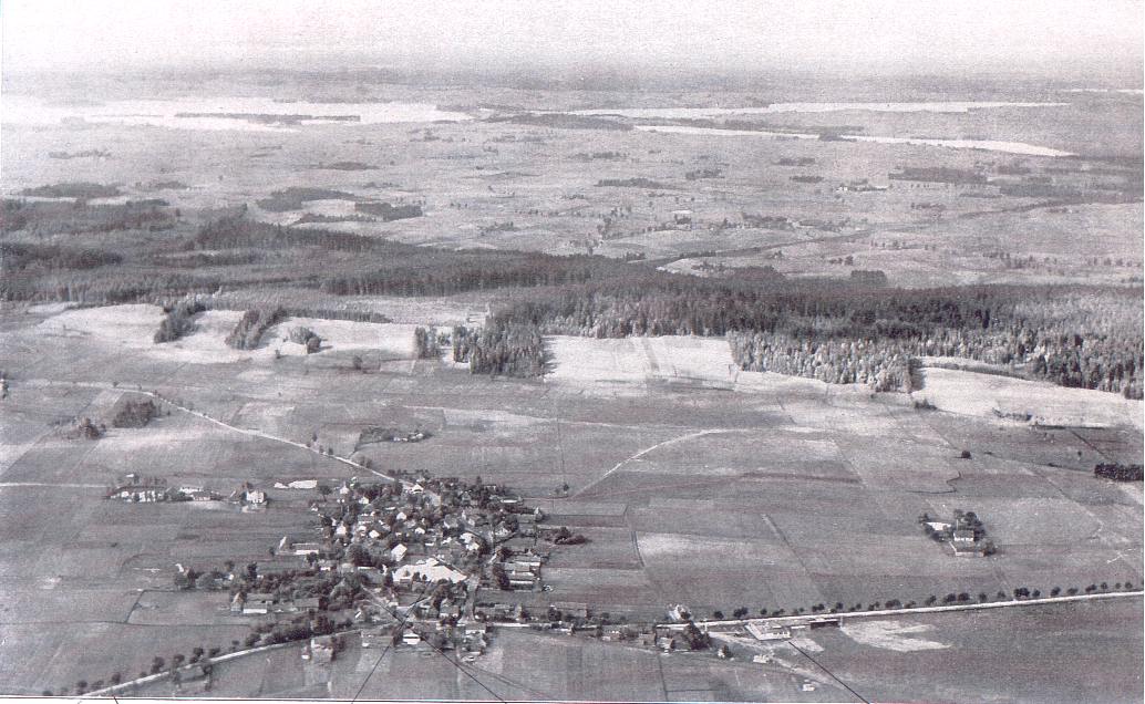 Masz przed oczyma rewelacyjne zdjęcie, wykonane w 1928 roku z samolotu pokazujące wieś Dajtki. Na samym dole widoczna droga, to dzisiejsza stara ul. Sielska. W lewo w kierunku Olsztyna, w prawo, równolegle z lotniskiem w kierunku Ostródy. Przy tej drodze (ul. Sielskiej) widoczny biały, parterowy budynek to biuro lotniska. Na środku wsi Dajtki było jeziorko, tusz obok kościoła. W latach osiemdziesiątych, zamiast go oczyścić po prostu zasypano. Droga polna (na zdjęciu w lewy skos idąca) to dzisiejsza ulica Żniwna, do Gronit. Już wtedy, w 1928 roku aparaty fotograficzne i klisze były tak dobre, że na tym zdjęciu widoczne jest odległe o prawie 10 kilometrów Jezioro Wulpińskie( w górnej części zdjęcia). Leży ono między Uniszewem, Sząbrukiem i Dorotowem. Jak byś wytężył wzrok i pamiętał którędy przebiega linia kolejowa, to dostrzeżesz ją na tym zdjęciu. |